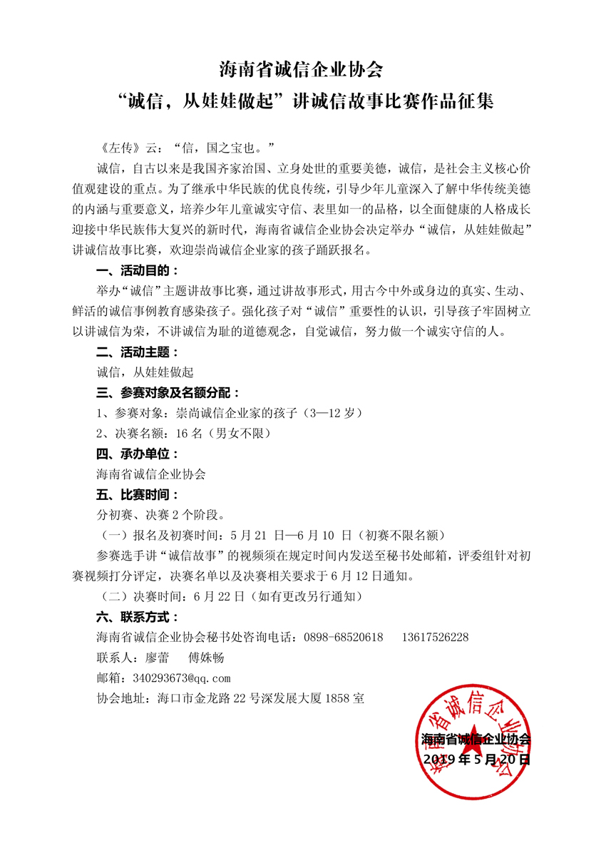 海南省誠信企業協會 “誠信,從娃娃做起”講誠信故事比賽作品征集