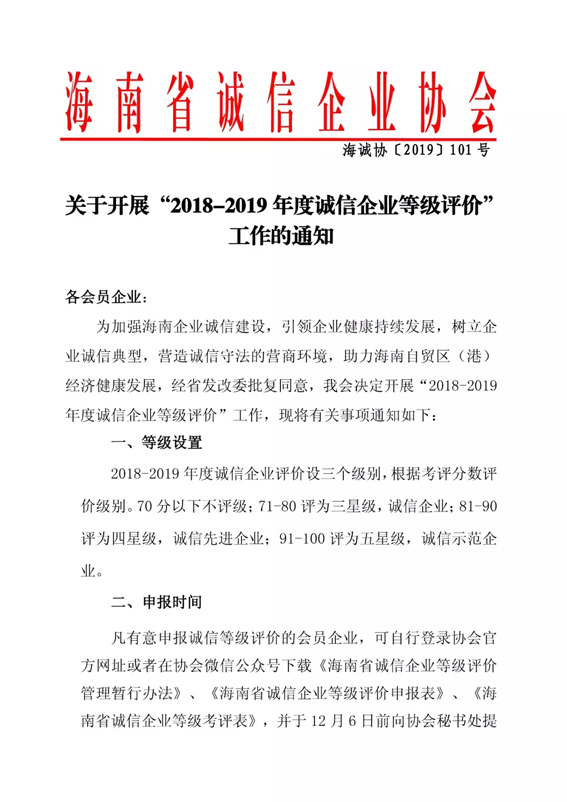 為加強(qiáng)海南企業(yè)誠(chéng)信建設(shè),引領(lǐng)企業(yè)健康持續(xù)發(fā)展,樹立企業(yè)誠(chéng)信典型,營(yíng)造誠(chéng)信守法的營(yíng)商環(huán)境,助力海南自貿(mào)區(qū)(港)經(jīng)濟(jì)健康發(fā)展,經(jīng)省發(fā)改委批復(fù)同意,我會(huì)決定開展“2018-2019年度誠(chéng)信企業(yè)等級(jí)評(píng)價(jià)”工作,現(xiàn)將有關(guān)事項(xiàng)通知如下: