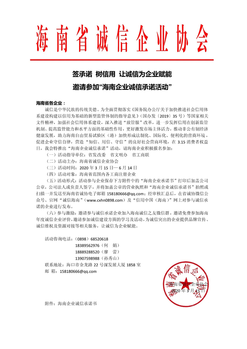 誠信是中華民族的傳統美德。為全面貫徹落實《國務院辦公廳關于加快推進社會信用體系建設構建以信用為基礎的新型監管體制的指導意見》(國辦發〔2019〕35號)等國家相關文件精神,加強社會信用體系建設,深入推進“放管服”改革,進一步發揮信用在創新監管機制、提高監管能力和水平方面的基礎性作用,更好激發市場主體活力,推動非公有制經濟健康發展,助力海南自由貿易試驗區(港)加快形成法制化、國際化、便利化的營商環境,促進企業守信自律,營造“知信、用信、守信”的良好社會營商環境,在3.15消費者權益日,我會特推出“海南企業誠信承諾”活動,請海南企業積極報名參加: