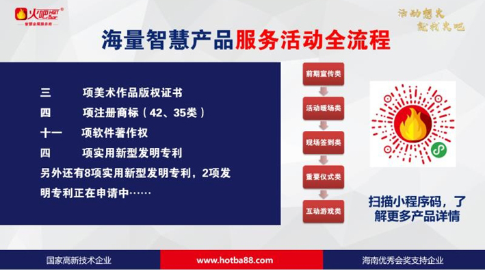 海南省誠信企業(yè)協(xié)會會員—海南火吧時代科技有限公司專注于會議會展技術(shù)服務(wù),始終堅守“讓活動更高效、讓現(xiàn)場更火爆”的創(chuàng)業(yè)初心,搭建了我國首個會展科技成果轉(zhuǎn)化平臺——火吧,現(xiàn)已成功掛牌海南省股權(quán)交易中心,企業(yè)代碼為90963。