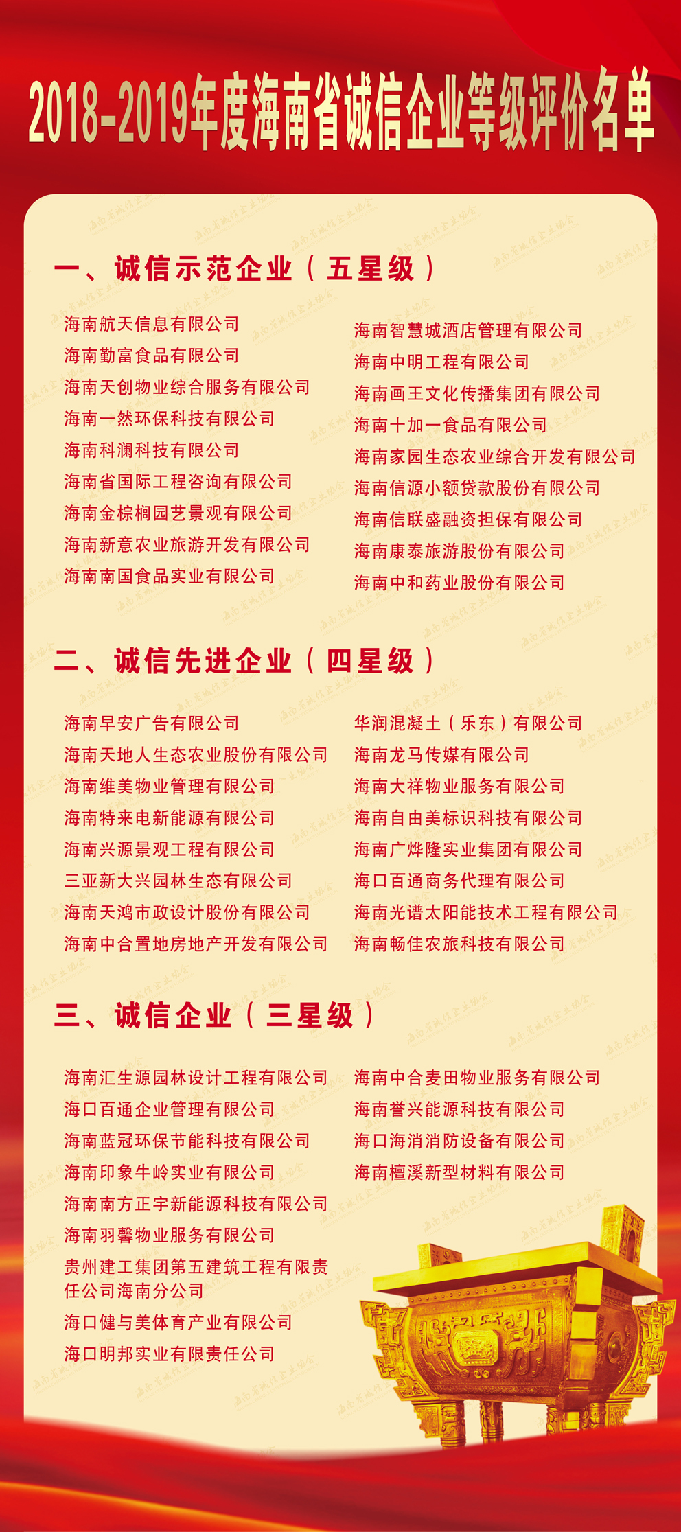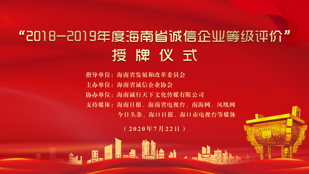 7月22日,由海南省發(fā)改委等政府部門指導(dǎo),海南省誠信企業(yè)協(xié)會主辦、海南誠行天下文化傳媒有限公司協(xié)辦的“2018-2019年度海南省誠信企業(yè)等級評價”授牌儀式在海口市民游客中心隆重舉行。
