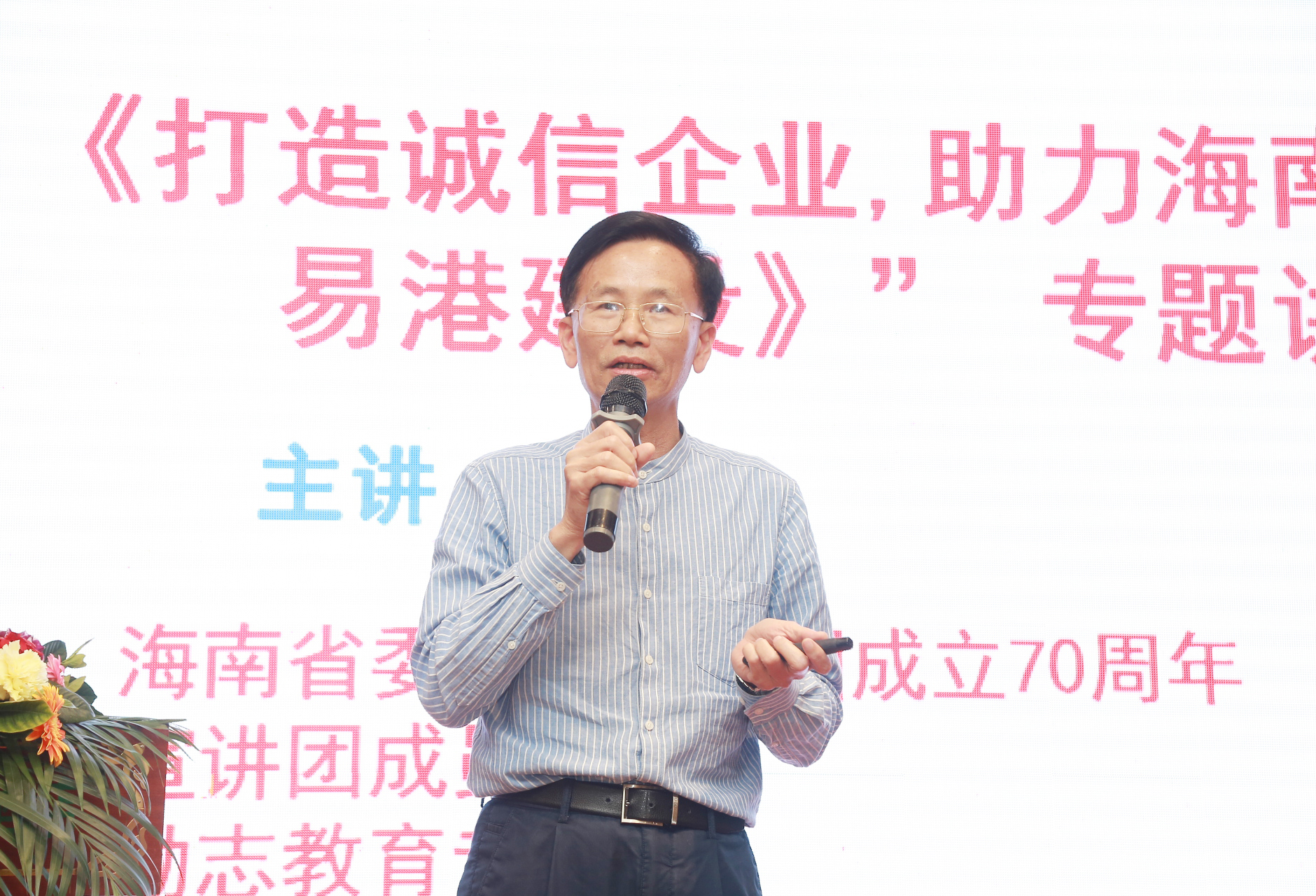 海南省誠信企業協會宣講團團長廖勇老師發言,廖老師說弘揚誠信美德,樹立誠信之風,誠信是一切道德的基礎和根本,傳播誠信文化一直是海南省誠協的宗旨,號召更多的企業家參與海南自貿港社會信用體系建設中去。