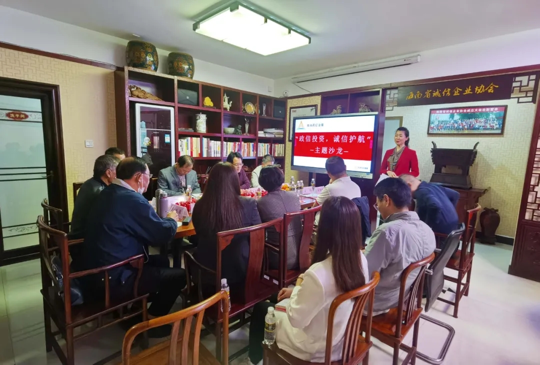 ●3月23日,海南省誠信企業協會會員單位海南政信金服公司在協會誠友之家舉辦“政信投資、誠信護航”主題沙龍活動。原南海隊航空司令張志成將軍、省工信廳王家華副廳長、原海南省無線電監督管理局杜秀茂局長、省誠信企業協會孫秀山會長、談德榮監事長、于濱副會長、法律維權委員會宋欽永律師,政信財務咨詢管理有限公司總裁王馮儒、海南政信金服公司董事長黃穎、監事長付開興,以及來自金融行業的專業人士和企業家朋友共二十多人參加,共同探討新共贏生態下的政信事業。