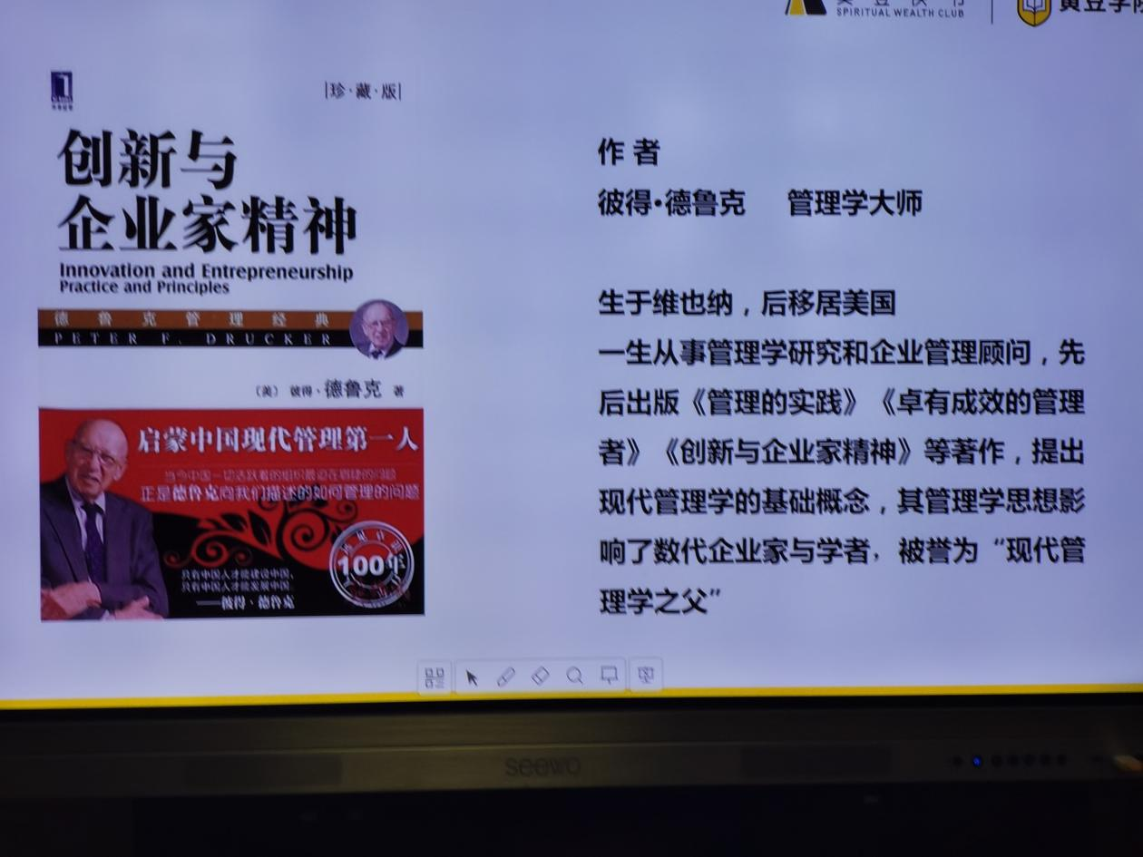 在座的十幾位企業(yè)家朋友共同分享了書籍《創(chuàng)新與企業(yè)家精神》,本書作者者彼得·德魯克 ,管理學大師一生從事管理學研究和企業(yè)管理顧問,提出現(xiàn)代管理學的基礎(chǔ)概念,其管理學思想影響了數(shù)代企業(yè)家與學者,被譽為“現(xiàn)代管理學之父”。