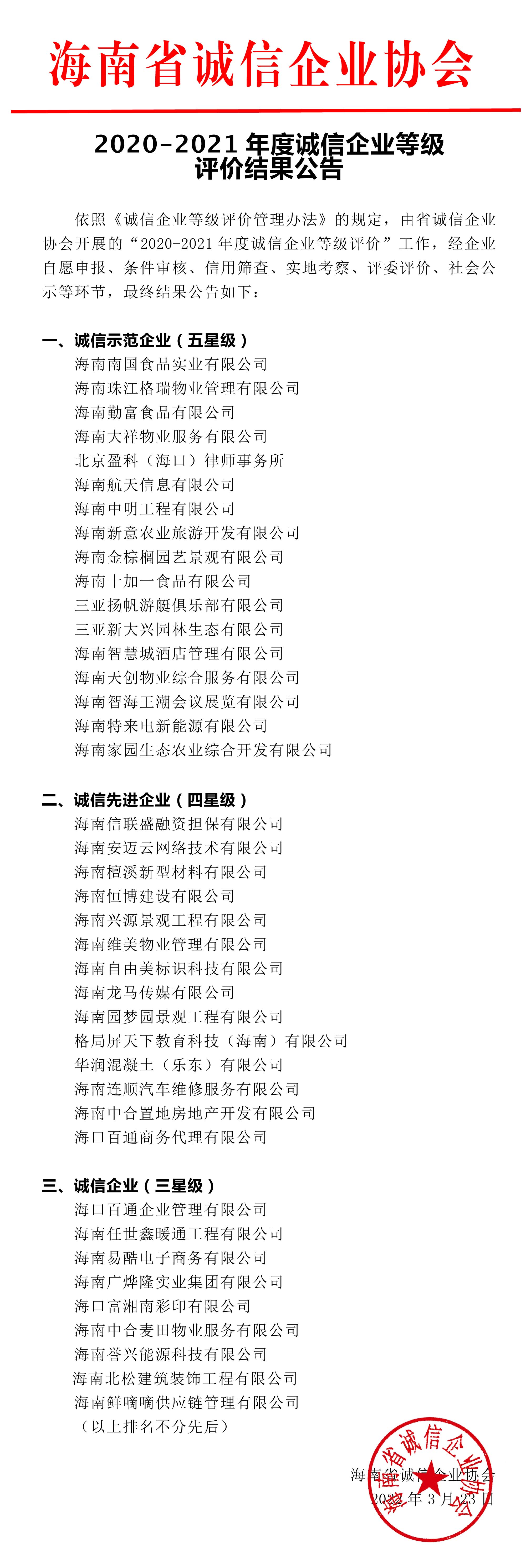 海南省誠信企業協會 2020-2021年度誠信企業等級評價結果公告
