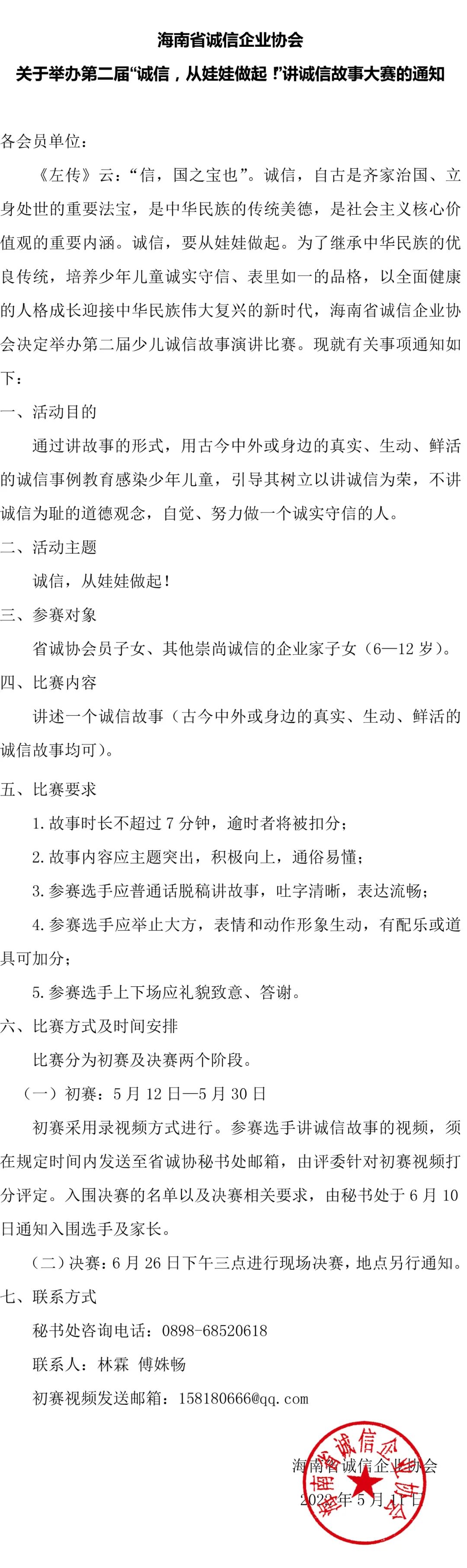《左傳》云:“信,國之寶也”。誠信,自古是齊家治國、立身處世的重要法寶,是中華民族的傳統美德,是社會主義核心價值觀的重要內涵。誠信,要從娃娃做起。為了繼承中華民族的優良傳統,培養少年兒童誠實守信、表里如一的品格,以全面健康的人格成長迎接中華民族偉大復興的新時代,海南省誠信企業協會決定舉辦第二屆少兒誠信故事演講比賽。現就有關事項通知如下: