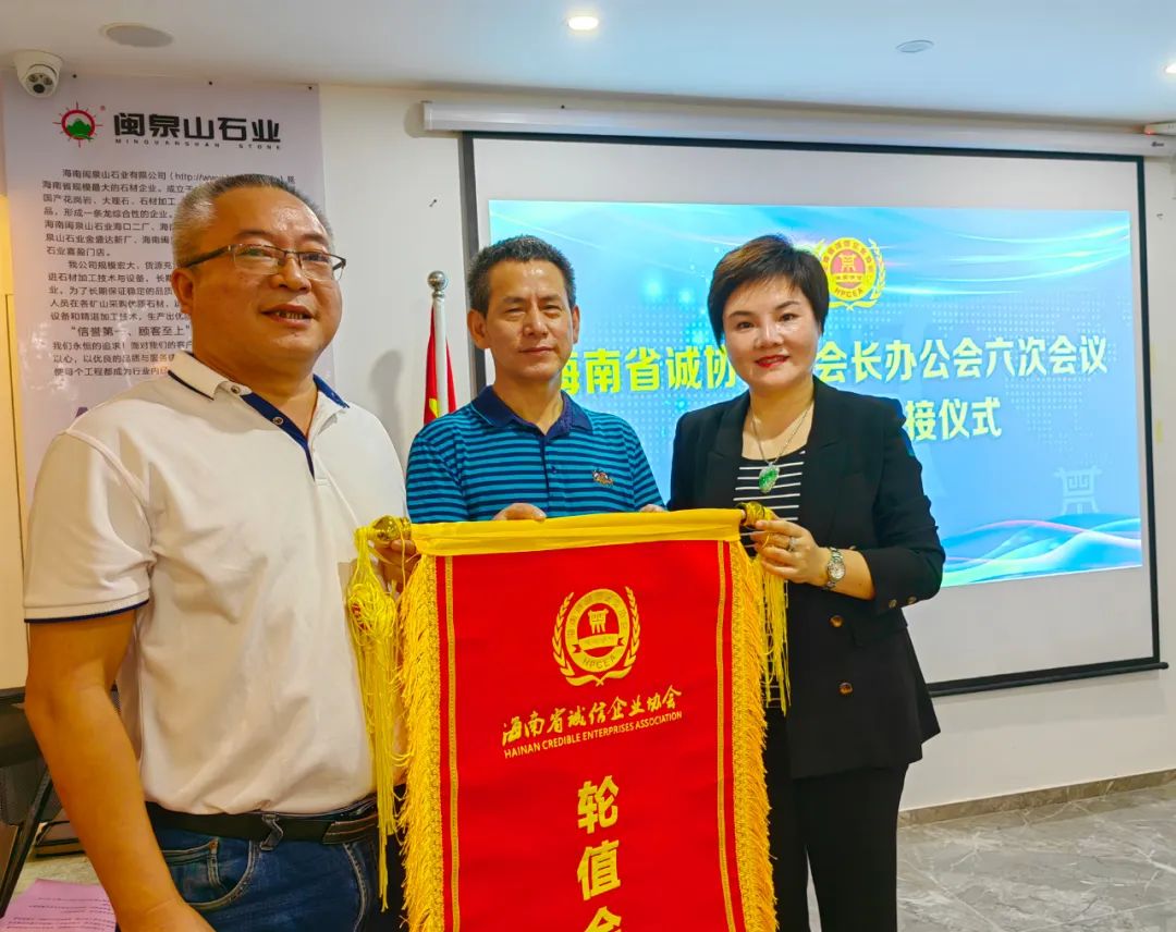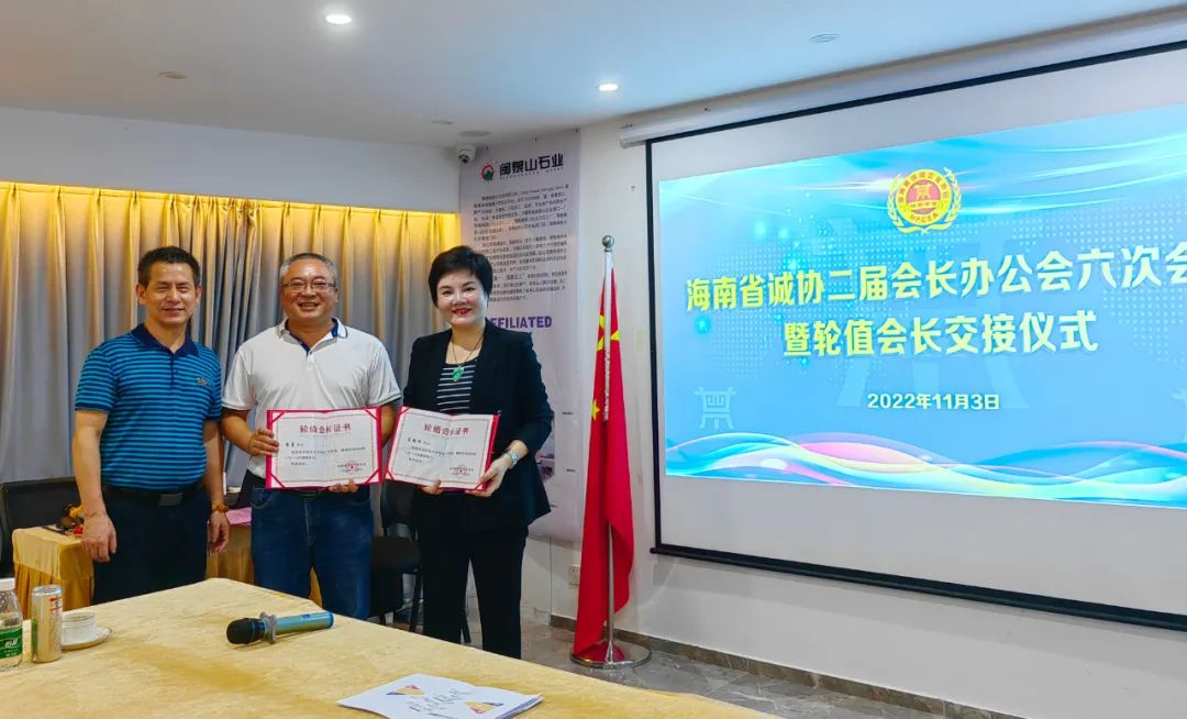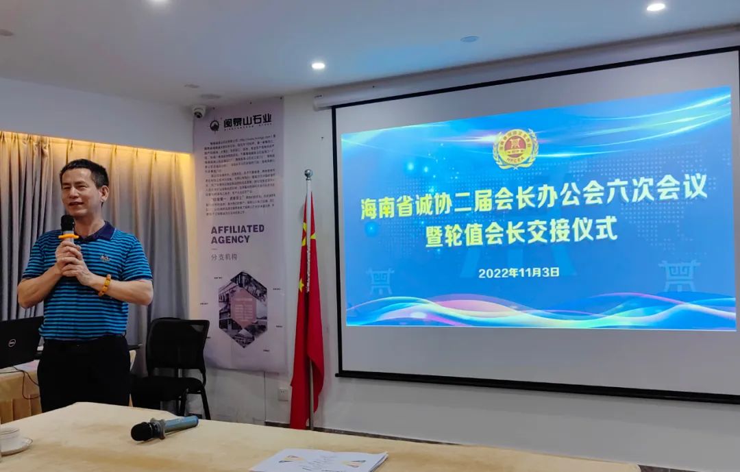 在會上,林霖代表秘書長向大家匯報了省誠協(xié)2022年9-10月份重點(diǎn)工作,海誠協(xié)和多家會員企業(yè)簽定了戰(zhàn)略合作發(fā)展協(xié)議并與海南省自由貿(mào)易區(qū)跨境貿(mào)易商會共同簽署了戰(zhàn)略聯(lián)盟協(xié)議;會長孫秀山、副會長周勤富和石宜伽參加省工商聯(lián)舉辦的民營企業(yè)信用體系建設(shè)培訓(xùn),石總和周總代表省誠協(xié)介紹企業(yè)誠信建設(shè)先進(jìn)經(jīng)驗(yàn)等。9-10月輪值會長博眾集團(tuán)唐明山董事長(代表李詠婷)做了輪值工作總結(jié);孫會長給11-12月輪值會長頒發(fā)輪值會長證書及錦旗,完成輪值工作交接儀式;11-12月輪值會長廖勇(誠協(xié)顧問兼講師)和呂翹羽(海南閩泉山石業(yè)有限公司總經(jīng)理)做了2022年度最后兩個月的輪值工作計劃:黨的二十大精神解讀活動、心連心慈善行動和給會員單位舉辦脫口秀演講學(xué)習(xí)班等,內(nèi)容非常豐富。