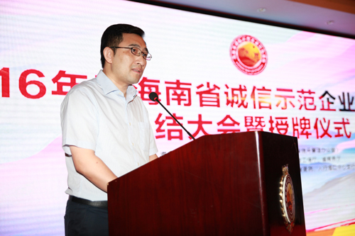 2016年度海南省誠(chéng)信示范企業(yè)總結(jié)大會(huì)暨授牌儀式于7月4日在海南迎賓館成功舉辦。海南省社會(huì)信用體系建設(shè)聯(lián)席會(huì)議40多個(gè)成員單位代表,27家誠(chéng)信示范企業(yè)代表,海南省信用協(xié)會(huì)、海南省誠(chéng)信企業(yè)協(xié)會(huì)等商協(xié)會(huì)及省內(nèi)部分企業(yè)代表150余人參加了會(huì)議,省政府林濤副秘書(shū)長(zhǎng)出席會(huì)議并為誠(chéng)信示范企業(yè)授牌。