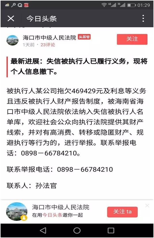 據悉,這是海口中院在海南省首創利用大數據精準定位,由今日頭條向被執行人周邊5公里范圍內的手機用戶彈窗推送其失信信息,重拳出擊“老賴”。發布日當天,就有一名“老賴”連夜趕至法院主動提出要履行義務,并請求將其從失信名單中撤銷。
